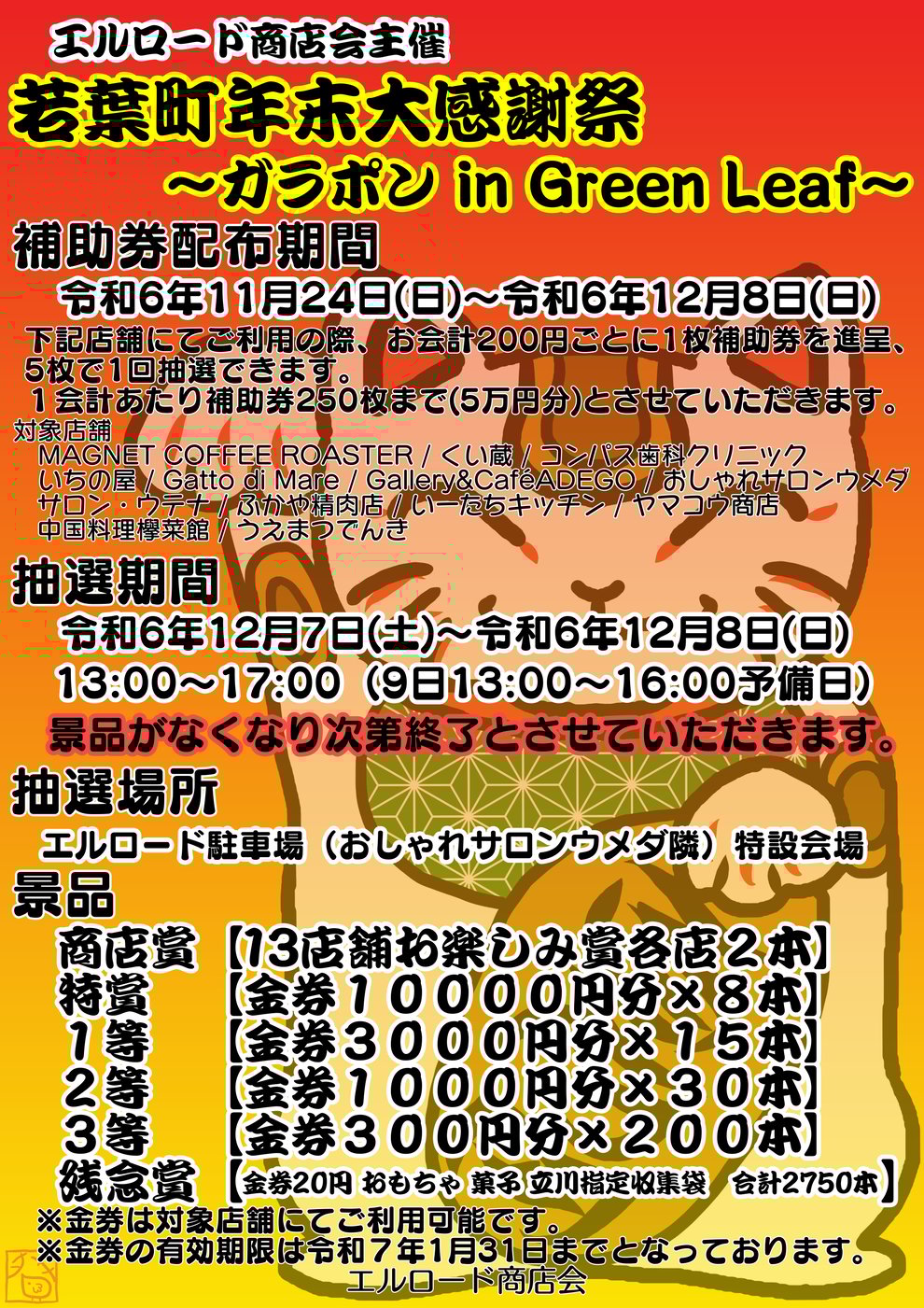 24日 11月 2024 若葉町年末大感謝祭~ガラポンin GreenLeaf~ 若葉町年末大感謝祭~ガラポンin GreenLeaf~ 本日よりガラポンの抽選補助券の配布が始まりました! 200円で1枚、5枚で1回抽選できます。 今年は久しぶりの商店賞の復活もありますので、皆様奮ってご参加ください♪ 詳しくは加盟店補店頭ポスター、チラシをご覧くださいませ。 tagPlaceholderカテゴリ: